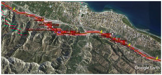 The refined CAD centerline was then imported into the Google Earth online platform (https://earth.google.com, access on 18 January 2023) and using the satellite views and the Google Street View imagery in conjunction, the location of km posts was determined. This location is of utmost importance for microscopic road safety analyses, as all elements of the analysis (crashes, speed limits, etc.) are recorded according to those locations (GPS use for crash location recording is not performed in Greece). The km posts, as identified in Google Earth, were subsequently imported into the base CAD drawing of the motorway and a road chainage system (stations) was established.