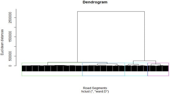 The next stage of the statistical analysis carried out within the framework of this research focuses on the creation of crash risk level clusters of the examined motorway segments. For this purpose, agglomerative hierarchical clustering was applied through the “hclust” function of the stats R package []. As also mentioned in Section 4.2, the Euclidean distance between single observations of the dataset and Ward’s minimum variance method as the linkage criterion were used. The variables considered for the formation of the risk level clusters of the motorway segments under consideration correspond to the number of total road crashes by segment length and the respective AADT of each segment. The selection of the number of clusters was based on the dendrogram illustrated in Figure 3.