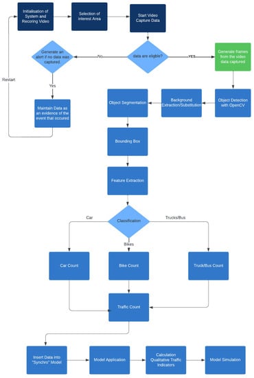 We address these questions below, with the concrete results obtained by also applying the data comparison model. Traffic processes are complex and dynamic; therefore, there is a need for frequent traffic counts in relation to time and space, especially in urban areas, because there is a need to adapt the forms of traffic control, traffic optimization or supply, in accordance with the traffic’s demand []. Until recently, traffic volume counts were usually realized through a manual method. Now, with the beginning of the use of advanced automatic techniques, special devices are being applied through which the realization of traffic counts is enabled automatically. Therefore, the analysis and evaluation of the quality of the basic information (traffic counts) obtained through cameras and the processing of this information in comparison to the methods of manual traffic counting have been the target of this research. Opportunities to bring engineering support specialties together through technology may be found by utilizing the performance technology and database capabilities of technology information management systems []. YOLO has developed a similar system which consists of dividing an image into N equally sized grids of M × M. Each grid is responsible for detecting and localizing any objects that are present in its region []. These grids can also predict the bounding box coordinates of an object, relative to the coordinates of the cell, as well as the object marker and the probability of the object being present in the cell. This process reduces the computational burden since both the detection and recognition of objects are handled by the cells of the image; however, it can lead to a lot of repetitive predictions due to numerous cells detecting the same object with distinct bounding box predictions []. Some authors [] have proposed a scheme as part of a research project that concluded shortly before the public release of YOLO version 4, which includes new methods that likely improve classification, detection, and counting rates []. Abdelwahab [] evaluated the proposed method; three experiments were employed using five videos representing different circumstances. In all experiments, the GMM was used for creating the background model for only the ROI []. Other authors (Ref. Lin Zheng, Junjiao) provided a new method for the rapid detection and classification of traffic anomalies and improved the accuracy of detection and classification []. Although manual methods for traffic counting have been shown to be successful in terms of the quality of the data obtained, they require time and commitment, a large number of staff, and also the data processing requires time equivalent to the counting time. Therefore, the application of automatic counting methods, enabling efficiency in terms of the time required to obtain the information and the data processing as well as the quality of this information, is an enormous contribution to the planning, projection and efficiency of traffic management. Automated traffic data collection has been sought in transportation applications to reduce cost and improve efficiency compared to manual data collection [].