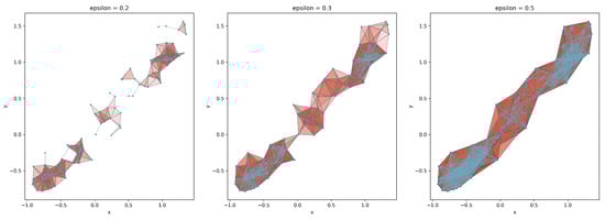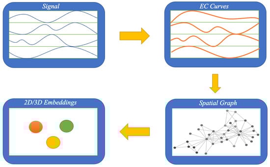 A simplicial complex-based method, more specifically topological invariants, is a mathematical tool that can be used to distinguish if two topological subjects are the same. This paper uses the Euler characteristics (ECs) as the topological invariant for characterizing temporal behaviors. EC is a general topological invariant that is utilized to capture the geometric properties of complex datasets with a reduced dimension and complexity while retaining the most significant information [,,]. Given a time series, its topological property can be distilled into an EC curve through the application of a manifold filtration outlined in Section 3.2.2. One important benefit of the simplicial simplex is that it is intrinsically robust with respect to noise. For example, squeezed and unsqueezed water balls may appear very differently (e.g., due to random squeezing forces). However, their topological geometries are the same and can be identified from the simplicial complex.