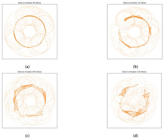 Example of different noise level with same first Betti number 1. (a) Noise Level 0, (b) Noise Level 5, (c) Noise Level 10, (d) Noise Level 15.