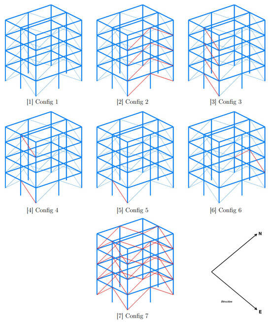 The first benchmark structure under analysis is the ASCE Phase II SHM benchmark experimental structure developed by the IASC-ASCE SHM Task Group []. It is a 4-story, 2-bay by 2-bay steel-frame scale-model structure whose footprint dimensions are 2.5 m × 2.5 m, and the height is 3.6 m. Figure 5 shows the benchmark structure. This benchmark model was constructed and tested in the Earthquake Engineering Research Laboratory at the University of British Columbia (UBC). Ambient and forced vibrations were conducted in the tests. Ambient excitations include winds, pedestrian effects, and traffic loads. Forced vibration was conducted using an impact hammer and electrodynamic shaker. The test data were published in 2003 []. Fifteen accelerometers were positioned on the structure, with three being placed on each of its four floors and one roof. The placement included one at the east face, one at the west face, and one near the central column. Only twelve accelerometers were used for this study since we ignored accelerometers on the ground. Seven damage cases of the first benchmark structure were simulated under ambient excitation. Each scenario consisted of 20 recorded samples, with each sample featuring 1500 timesteps (a timestep of 0.05 s). Structural benchmark cases are described in Table 1 and Figure 6. More details about this benchmark structure, regarding the structural properties (mass and stiffness assignment, connections, etc.) and dynamic tests, can be found in [].