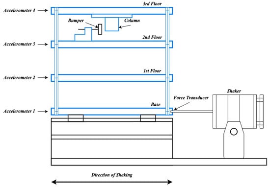 The building shown in Figure 7 is a three-story structure, referred to as the second benchmark building. Its simulated data was published by Los Alamos National Laboratory []. The structure features aluminum columns and plates connected using bolted joints, with a rigid base. Each floor of the structure comprises 4 aluminum columns, measuring 17.7 cm in length, 2.5 cm in width, and 0.6 cm in thickness. These columns are attached to top and bottom aluminum plates, which are 30.5 cm by 30.5 cm and 2.5 cm in thickness, creating a 4-degree of freedom system. A center column, which is 15.0 cm in length, 2.5 cm in width, and 2.5 cm in thickness, hangs from the top floor and may cause nonlinear behaviors when it interacts with a bumper located on the second floor. The position of the bumper can be adjusted to vary the level of nonlinearity. For the purposes of this study, a shaker was mounted on a base plate (76.2 × 30.5 × 2.5 cm) to provide excitation, and a force transducer was used to measure the force from the shaker at the end of the stingers. The response was measured on the opposite side from the excitation source on each floor using four accelerometers. Each damage case includes 40 recorded samples (with the exception of Case 2, which has 160 samples), and each sample has 2000 timesteps (where each timestep equals 3.1 ms). The description of the structural benchmark can be found in Table 2.