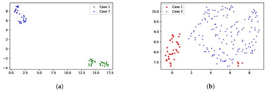 Low-dimensional representation of binary classification for both datasets: (a) Dataset 1: Case 1 (Green), Case 7 (Blue); (b) Dataset 2: Case 1 (Red), Case 2 (Blue).