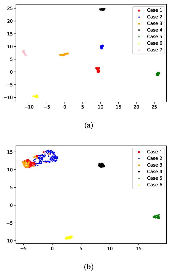 Low-dimensional representation of all classes classification for both datasets: (a) Dataset 1: low-dimensional representation of all cases; (b) Dataset 2: low-dimensional representation of all cases.