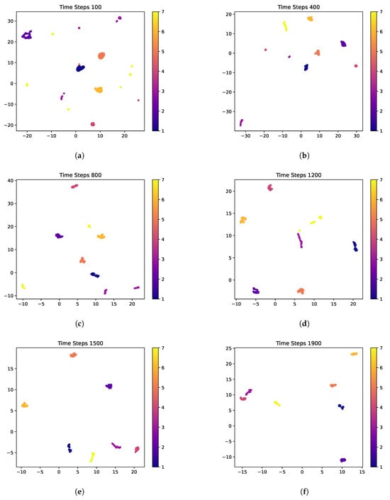 Examples of embeddings in different time lengths ((a) 100; (b) 400; (c) 800; (d) 1200; (e) 1500; (f) 1900) used for a single data point (Dataset 1).