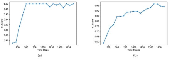 Five-runs accuracy performance (F1 score) vs. time steps used for a single point: (a) Dataset 1; (b) Dataset 2.
