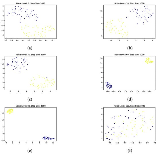 Examples of embeddings in different noise levels ((a) 0; (b) 10; (c) 20; (d) 600; (e) 80; (f) 100); 1000 time steps used for single data point (Dataset 1).