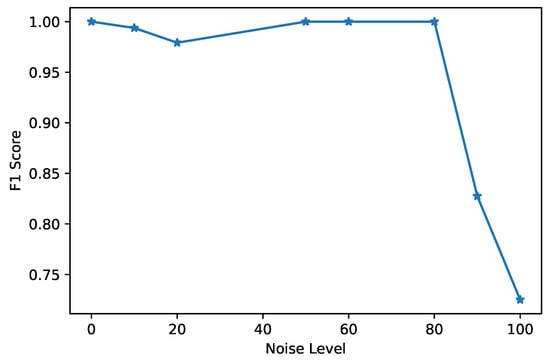 In this paper, we checked how accuracy changes at noise levels from 0 to 100, as defined in Step 4. We have some embeddings shown in Figure 14, and the relation of accuracy changes at different noise levels is shown in Figure 15. The results indicate the robustness of the algorithm in the presence of noise. The classification accuracy did not show a significant decrease until the 90 noise level was reached.