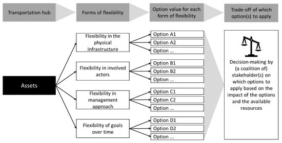 The main question to be answered is: How can flexibility for infrastructure on passenger transport hubs impact the societal costs for all stakeholders by using option value? The answer is that the identified forms of flexibility—flexibility of physical infrastructure, stakeholder involvement, management approach and goal(s) over time—can impact the societal costs by giving decision makers an overall overview of which options of flexibility for their infrastructure application are available and which impact they can have. This gives decision makers the opportunity to make an overall trade-off of (a combination of) the best fitting option(s) based on available resources. Regarding the challenge in initiating this approach towards attaining this optimal societal impact, the question of whether there will be a way out can be answered positively for ACSA: four areas of attention for further research and/or application are found in the development of this paper which will offer this way out.
