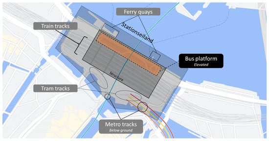 The scope of the ACSA case focuses on the relation between infrastructure (electricity) and planning (transport), given the societal urgency of this matter. The geographical scope is chosen since it has recently seen the development of charging infrastructure for buses []. It consists of one major station structure combined with transport infrastructure as indicated in Figure 3. The spatial focus is on the physical area of the bus platform, which is needed for the different transport providers which use charging infrastructure or might use it in the future. It includes the platforms and supporting electricity infrastructure for the charging of buses (from grid connection to the platform). This includes the use and availability of physical space and infrastructure. Tram, metro, train and ferry infrastructure are outside the direct scope due to limited current shared infrastructure applications.