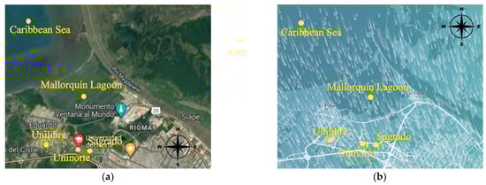 The bridges under evaluation are located in Puerto Colombia, Colombia, approximately 3.5 km from the Caribbean Sea (Figure 2a). The conditions at this location promote accelerated corrosion of the elements. The structures under study are similar in geometry, materials, and structural configuration, but differ significantly in their degree of deterioration and functionality (Figure 1). The difference in their degree of deterioration was caused by the different maintenance made by private institutions located nearby the bridges. Therefore, the question to solve is how the degree of corrosion of a pedestrian bridge affects the dynamic behavior of the structure. The bridges have been named after the educational institution next to them, and therefore, in this document, they will be referred to as “Uninorte” (Universidad del Norte), “Sagrado” (Sagrado Corazón School), and “Unilibre” (Universidad Libre). The linear distance between the Sagrado bridge and the Uninorte bridge is approximately 690 m, and the distance between the Uninorte bridge and the Unilibre bridge is approximately 1600 m, which indicates that the level of exposure to the marine environment is similar in the three bridges since the three structures are in a radius parallel to the spot described as Mallorquín swamp (lagoon) border Figure 2b.