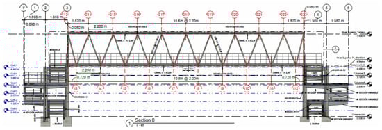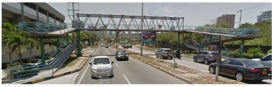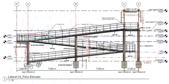 The Uninorte, Sagrado, and Unilibre bridges are steel pedestrian bridges with a Warren-type truss structural configuration. The bridge’s geometry is similar to that shown in Figure 1, Figure 3, Figure 4, Figure 5 and Figure 6, Table 1, and Section 4.1.1 (Bridges geometry).
