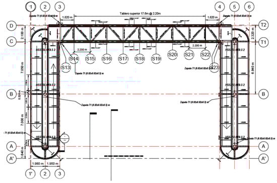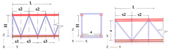 A structural survey was performed to define the geometry of the bridges. With this information, drawings and numerical modeling were completed. It was identified that the geometry of the bridges is similar since the cross-sections of the elements for the upper and lower chords are the same (steel built-up box beam composed of two C-sections welded face-to-face). In addition, the secondary elements (diagonals and struts) in the vertical and horizontal plans (all detailed with a 103 × 103 × 4 mm structural steel tube) are the same. However, the difference consists in the lower struts of the Unilibre bridge detailed with a 58 × 200 × 4 mm C-section. Nonetheless, the general geometry of the structures under study is similar. Figure 11 shows a schematic view of the lateral, transverse and plan views of the bridges for identifying each element, and Table 3 shows the results of the measurements of elements on each bridge.