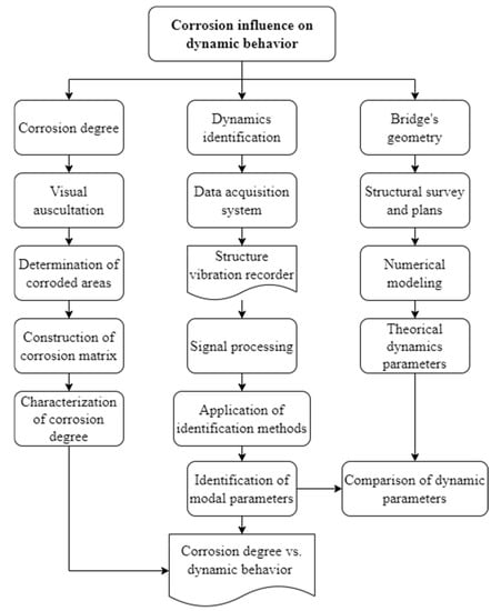 Then, a characterization of the generalized corrosion degree of each bridge is performed quantitatively through the corrosion matrix and the deterioration observed in the field inspections. The dynamic parameters and the degree of corrosion are analyzed to validate if and to what extent they are statistically correlated. Section 4 presents the results obtained for each bridge and each branch or step shown in the methodology. Finally, Section 5 presents the discussions, conclusions, and future work for the research.