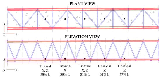 Five nodes were identified on each structure under study at distances proportional to the length of the deck. Measurements were taken in the gravitational (Z) and transverse (X) directions of the deck (Figure 9).