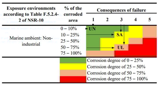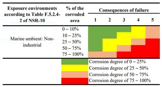According to the recommendations of the Corrosion College, the corrosion of a structure can be evaluated in an easy and practical way, relating the severity of the exposure environment to the consequences of deterioration []. As a result, a matrix with a color scale indicating the degree of corrosion of the structure is obtained. The authors took the Corrosion College corrosion matrix as a basis, considering only one exposure environment according to Table F.5.2.4-2 of NSR-10 [].