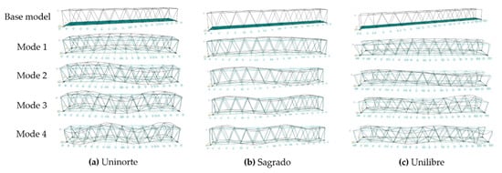 Figure 12 shows the results of the analytical models. Each column depicts the first four vertical vibration modes of each bridge. Table 4 shows the frequency values associated with the first four vertical vibration modes, in the three bridges modeled for the initial numerical model.