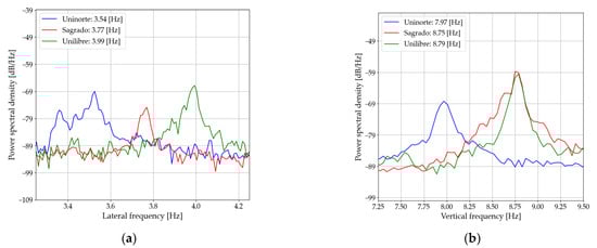 Power spectral density of experimental frequencies of the bridges: (a) lateral and (b) vertical.