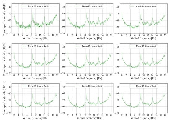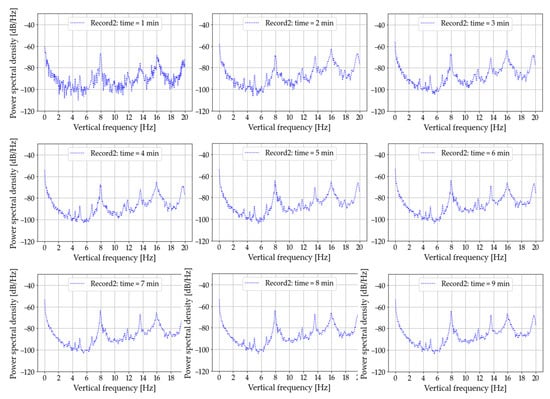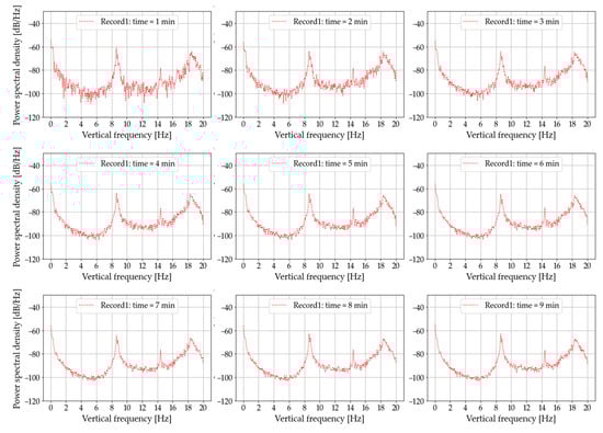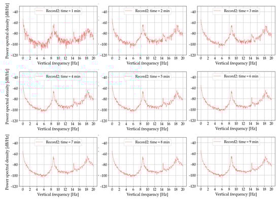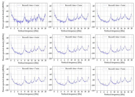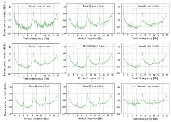 Power spectral density of the first nine vertical frequency observations of the Sagrado bridge.
