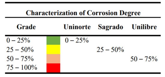 The third line is the characterization of the corrosion degree, which is obtained through the corrosion matrix built for the authors (Section 3.3). With the knowledge of the percentage of corroded areas and the most probable consequence of the damage, it is possible to assess the generalized degree of corrosion in the structure by selecting a color in the matrix, thus determining a range of values for this variable.