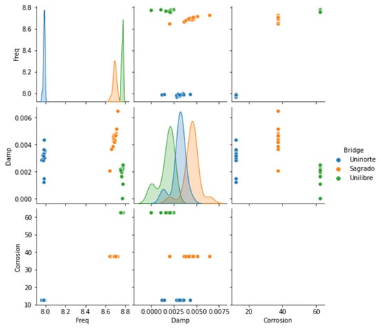 Figure 23 shows the bivariate pairwise distributions of the dataset of the three bridges. The dispersion matrix shows the pairwise relationship between the different variables. Correlation plots were made using the Python seaborn library for data visualization.