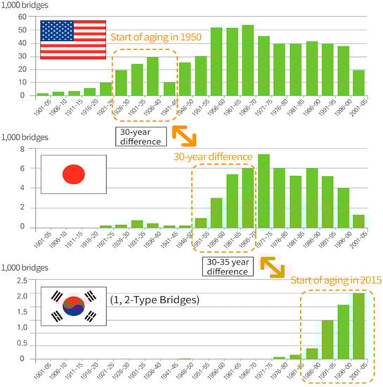 The analysis data presented in Figure 3 confirm the fact that the aging period of bridges in developed countries incurs important implications for South Korea. In the United States, bridges more than 30 years old began to emerge in 1950. In Japan, the aging of bridges began rapidly in 1980. In South Korea, many bridges were built along with the rapid growth of the economy since 1960. Hence, it can be seen that the aging of bridges began in 2015, about 35 years later, similar to that observed in the United States and Japan.