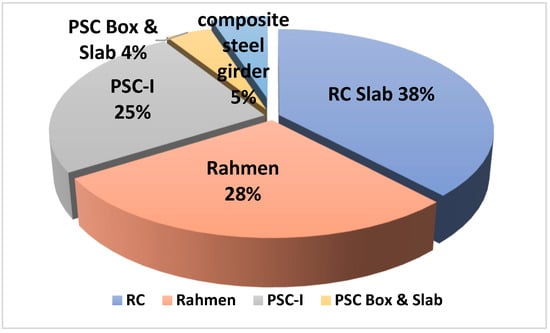 According to the “2016 State of Road, Bridges, and Tunnels Report” there are a total of 30,983 bridges, and the three most common types are RC slab, Rahmen, and PSC-I, as shown in Figure 4. These three types of bridges account for over 75% of the total bridges. Among them, the proportion of bridges over 30 years old was in the order of RC slab > Rahmen bridges > PSC-I.