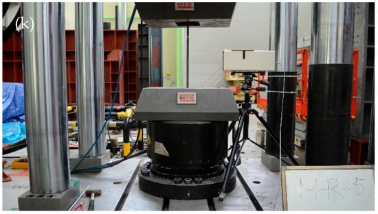 The procedure for the empirical experiment of an aging concrete bridge must first start with analyzing the performance of the bridge immediately before dismantling it, as shown in Figure 6a,b. The empirical experiment that can be conducted before dismantling the bridge is as follows: The basic condition of the bridge is evaluated. In addition, the load-carrying capacity and the behavioral characteristics according to the damage can be verified through vehicle load testing. If it is difficult to transport a dismantled section to the laboratory or transport the dismantled section, it is important to prepare equipment so that the performance can be verified before destroying the dismantled section at the site, as shown in Figure 6c. Most concrete bridges are first cut and not destroyed at once by their own weight. In this process, the specimens are cut into a girder and a slab is transported to the laboratory, as shown in Figure 6d. A basic structural experiment is conducted on the transported members, as shown in Figure 6e, to verify the change in the structural performance due to aging and to obtain the data for analyzing the correlation with the material experiment results [20,21,22,23]. In the case of a reinforced bridge, the rehabilitation method is directly applied to the same members, as shown in Figure 6f, and the destruction and fatigue tests are carried out to verify the effect of the rehabilitation method [24].