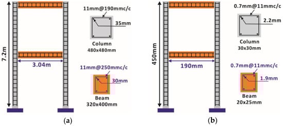 These seismic provisions stipulated in the Building Code of Pakistan are compatible with the American Concrete Institute ACI 318-08. Figure 1a shows the dimensions and reinforcement bars selected for the actual full-scale frame structure. The connection of the beam-column is designed to be hinged allowing the rotation without any translational displacement, whereas the base of the columns is assumed to be fixed ignoring the soil–structure interaction. The slenderness ratio of the columns () is determined to be 0.85 × 3.6/0.139 = 22, where 0.85 is the effective length factor for a column with a fixed base and hinged top determined from the Jackson and Moreland Alignment Charts, which provide a graphical determination of for a column of a constant cross-section in a multi-bay frame; 3.6 m represents the column height of a single story, and 0.139 m shows the value of the radius of gyration estimated from the basic formula of (where and are the second moment of area (m4) and cross-sectional area (m2) of the column, respectively).