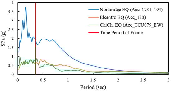 For the verification of the laws of similarity, the ground motions were selected based on the time period of the actual size structure. The natural time period of the actual size frame was calculated as 0.275 s by using the ASCE 7-16 12.8.2 analytical formula [42]. On this basis, three earthquakes including the 1999 Chi-Chi earthquake, Taiwan, 1940 El Centro earthquake, California, and 1994 Northridge earthquake, California were selected for the numerical simulation of the actual and scaled structure. The reason for their selection is that the peaks of the response spectrum of these earthquakes are within the range of the time period of the actual size structure as shown in Figure 2.