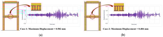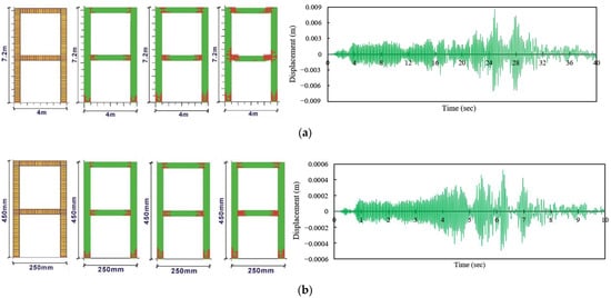 Analysis of actual frame and 1/16 scaled frame using Applied Element Method and time−history of displacement. (a) Cracked springs of actual structure at loading stages of 50, 100, and 200, (b) cracked springs of 1/16 scaled structure at loading stages of 50, 100, and 200.