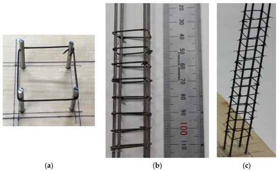 The geometric properties of the model are shown in Table 5. Based on these properties, it was decided to fabricate the formwork by aluminum angles with simple nuts and bolts as aluminum angles are lightweight and can give an excellent finish to the surface, which is very important for small-scale models. Due to the small diameter of the reinforcement bars, it was a challenging task to prepare the same size stirrups with a margin of 2 mm clear cover for micro-concrete. Figure 4a,b show the stirrups preparation and spacing between the stirrups. To tie the stirrups with beam and column reinforcement bars, a steel wire of 0.2 mm diameter was used to obtain the same effect as field conditions. To maintain a proper clear cover, small pieces of a 1.9 mm bar were attached to the main reinforcement bars so that the wires did not bend in the formwork. Figure 4c shows the prepared reinforcement cages for the beams and columns.