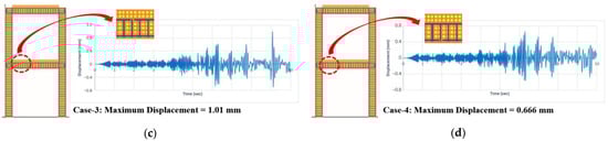 The actual size structure and the 1/16 scaled structure were analyzed against the above-mentioned ground motions by using the Applied Element Method (AEM) with similar geometric properties. The properties of the scaled model were reduced according to the 1/16 scale including the size of the elements in the analysis. The additional weight of 36 kg was also applied to the scaled model as per the laws of similarity. Furthermore, the ground motion duration was also contracted with the factor of as per Table 3. The deformed shape and cracks in the springs for the actual structure and scaled model were compared at three different stages of loading as shown in Figure 3. The analysis results show that both the actual frame and scaled frame exhibited similar crack propagation at different stages of loading. The maximum displacement was obtained for both cases and the time history of both frames is also shown in Figure 3.