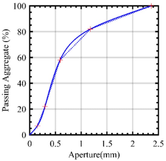 The values of the aggregate gradation curve were selected based on the maximum aggregate size given in the Naval Facilities Engineering Command [43]. The aggregate gradation curve used for the model concrete is shown in Figure 7. This gradation curve was achieved by performing the sieve analysis of locally available sand (#2 to #8 sandbags, available in Tokyo, Japan) and then by mixing the required proportions of each size. The curve in Figure 7 shows a monotonic increase of passing aggregate with respect to the aperture size.