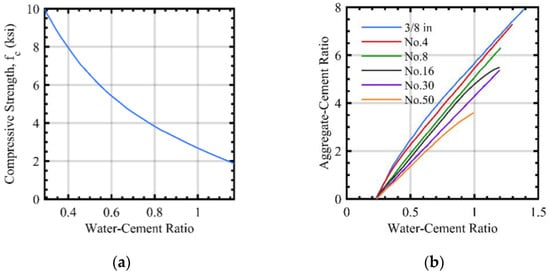 Following the steps given in the Naval Facilities Engineering Command [43], a value of water-to-cement ratio against the required compressive strength was obtained from the graph shown in Figure 8a. By using this water-to-cement ratio, the aggregate-to-cement ratio was calculated by using the graph shown in Figure 8b. As these values do not confirm whether the required strength will be achieved or not, for this purpose, four different mixes were selected as shown in Table 6, and a compression test was carried out to find the strength achieved for selected mixes. This step-by-step procedure gives an idea about the selections of the aggregate-to-cement ratio and water-to-cement ratio against the targeted strength of micro-concrete with excellent workability. On this basis, four different mixes were selected for the model as shown in Table 6.