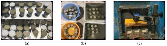 Casting of micro-concrete. (a) Freshly casted cylinders, (b) curing conditions, and (c) capping process.