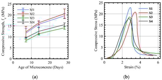 The compression test was conducted under the specifications mentioned in ASTM C-39 [46]. The testing was performed on the AG-100 kN Autograph Shimadzu testing machine. The applied strain rate was 0.3 mm/min. The compression tests of mix numbers M1 to M4 were conducted at the age of 7, 14, and 28 days. The results of the compression test are shown in Table 7. The relationships between the compressive strength and age of micro-concrete are shown in Figure 10a. The results show that mix M1 and M2 had similar strengths which are very close to the target strength, but due to the higher workability, M1 was selected for the model frame. The stress–strain relationship of the cylinders from M2 has been shown in Figure 10b which shows that the selected mix of micro-concrete has a 3% strain.