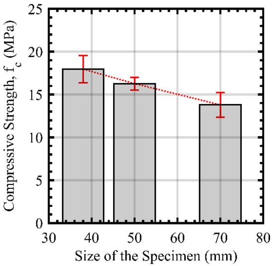 In this study, cylinders of 38 mm, 50 mm, and 70 mm diameters were cast and tested at the age of 14 days to see the size effect. The average compressive strength of three samples each are shown in Table 8. The trend of the decrease in strength by increasing the specimen size is shown in Figure 11. The decrease in strength for larger specimen sizes is significant. Almost 10% of strength reduces in 50 mm diameter cylinders when compared with 38 mm diameter cylinders. Similarly, a 23% decrease in strength was observed for 70 mm diameter specimens when compared with 38 mm diameter cylinders. This trend is almost similar to the trend of normal concrete.