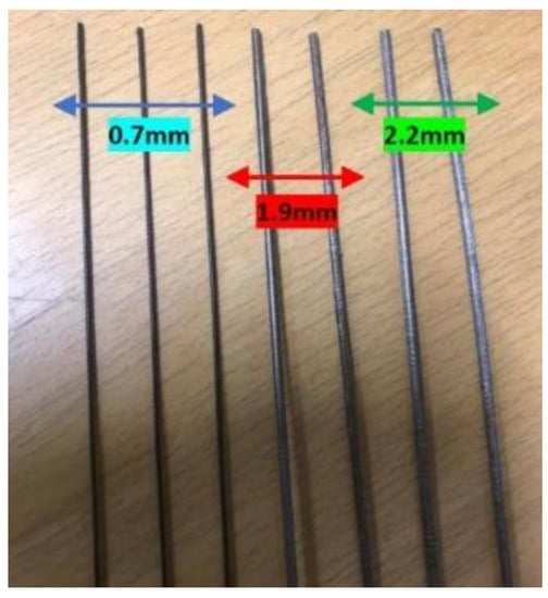 As the scale of the model structure was selected to be 1/16, the diameter of the reinforcing bars was very small. In this study, three different diameter bars were used for the reinforcement of the model structure. The sizes include 0.7 mm diameter bars for stirrups, 1.9 mm diameter bars for the main reinforcement of beams, and 2.2 mm diameter bars for the column reinforcement. These deformed bars, as shown in Figure 12, were manufactured by Kingo Seisakusho Co. Ltd., Tokyo. The tensile test on these bars was conducted by using the AG-50 kN Autograph Shimadzu testing machine with a loading rate of 1 mm/min. The average tensile strength of these bars is shown in Table 9. The design yield strength for the model structure was 345 MPa. The stress–strain relationships and tested samples are shown in Figure 13 which shows a satisfactory value of the yield strength of the scaled rebars.