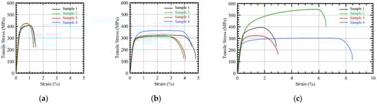 Stress–strain relationship of scaled reinforcement bars. (a) 0.7 mm, (b) 1.9 mm, and (c) 2.2 mm.