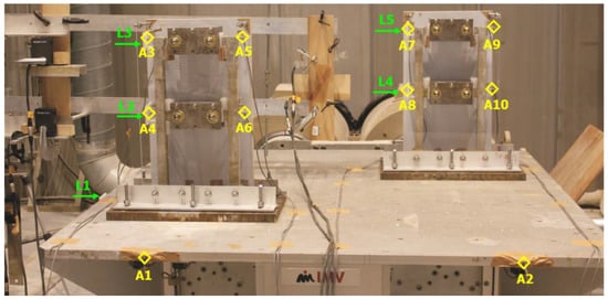 The model frames were instrumented with accelerometers and laser displacement sensors to assess their dynamic behavior. A total of 10 AS-2GB cable-integrated accelerometers with a ±19.61 m/s2 (±2 G) rated capacity were installed on both models. In addition to the accelerometers, five LB-300 ultra-long-range type laser displacement sensors were also installed on both models. The experimental setup for the shake table test is shown in Figure 14 which shows the location of all sensors. The model frames were built in 2D which implies that they cannot resist out-of-plane shaking, so to avoid out-of-plane failure of the model frames, frictionless rollers were mounted against the out-of-plane support to avoid out-of-plane failure.