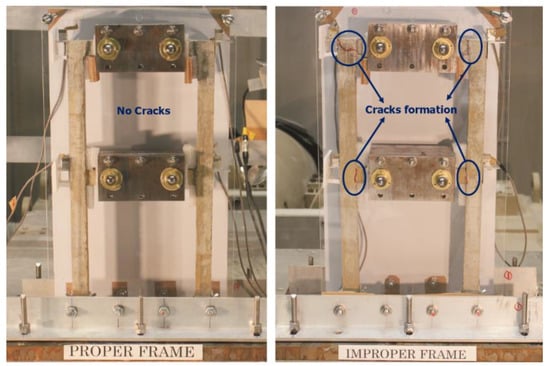(a) Cracks in the proper frame—Run 62 and (b) complete failure of the improper frame—Run 40.