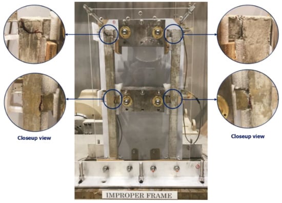 | 31 | No cracks | Significant cracks appeared in the beam–column joints when a 10 Hz frequency was applied for 40 s. The cracks in the frame are shown in Figure 17. Partial cracks appear in the base connection. |