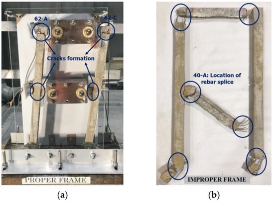 - The experimental results have proved that improper splicing details can reduce the capacity of reinforced concrete structures sufficiently, and the structure is highly vulnerable in case of an earthquake. The shake table test results demonstrate that the plastic hinges and damage points for the proper frame are the beam–column joints and the base connections as shown in Figure 19a, but if there is a provision of improper lap splice, then this can alter the damage point of the structure, triggering complete detachment of the beam with the improper lap splice as observed in Figure 19b at point 40-A.