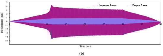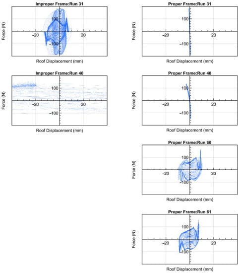The hysteresis load–displacement behaviors of both the proper and improper frames are shown in Figure 20. From the hysteresis after Run 31, it is evident that the improper frame has huge roof displacement as compared to the proper frame, indicating the initiation of bond–slip behavior. From this, there is the initiation of gradual strength degradation, due to the deterioration in bond stresses between the concrete and reinforcing steel bars. Ultimately, the hysteresis diagram after Run 40 shows the failure of the improper frame. On the other hand, the proper frame was still behaving structurally fine at Run 40, demonstrating the effectiveness of the lap splices of reinforcing bars. After Run 60, the roof displacement of the proper frame is increased. The difference in displacement at the roof of both frames at Run 20 and Run 30 is shown in Figure 21 which exhibits that the improper frame has a larger displacement since the beginning.