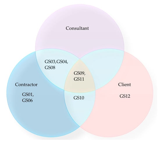 The overlap analysis technique was based on the ranking results to identify the common and unique critical government strategies between construction project stakeholders (e.g., consultant, contractor, and client). The overlap analysis technique is a decision-making technique to compare similarities and differences between multiple categories [72,73]. Government strategies for at least two stakeholders shape the overlap, and those unique to a specific stakeholder shape the non-overlap part.