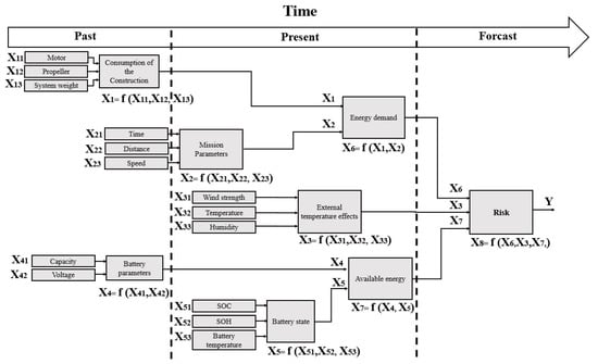 Many parameters must be considered during risk analysis. The presented case contains a lot of different parameters but shows a concise, easily understandable, and adaptable state. In the first case, the authors examine a not very complicated but sufficiently complex condition. Parameters are defined, and risks are associated using the literature [90,91,92] and results based on own measurements [93,94]. During the classification, the timeline was divided into past, present, and forecast (see Figure 2; in the text, these words are used in lower cases). The parameters derived from the UAV manufacture and the battery basic data belong to the past. The present time includes current conditions and temperature components, while the forecast section determines expected conditions and safe flight times.