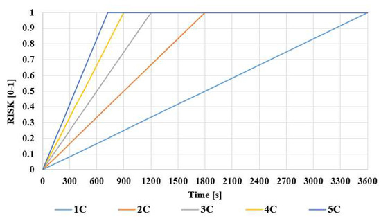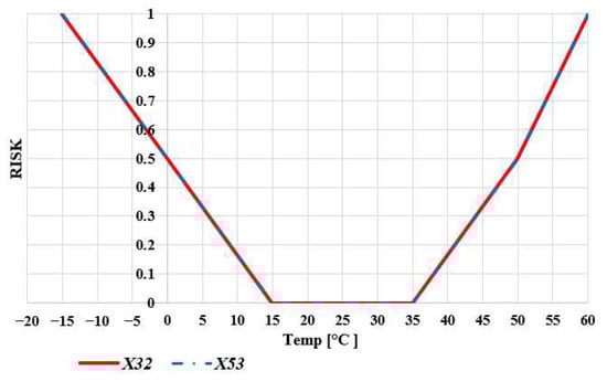 The external temperature is also an essential consideration for batteries. Too cold and too hot can both mean a drastic reduction in capacity [94]. The relationship between temperature and risk is shown in Figure 3.