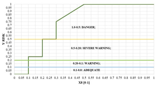 In Equation (3), is the product of Wind strength (), Temperature (), and Humidity risk . It is important to note that for all three external temperature parameters , , and , a risk conversion must be performed before use. The conversion for is determined from Table 1, the conversion for is determined from Figure 3, and the conversion for is determined from Table 2. In all cases, the output value is between 0 and 1, as shown below. The conversion of default wind force values to risk is summarized in Table 1.